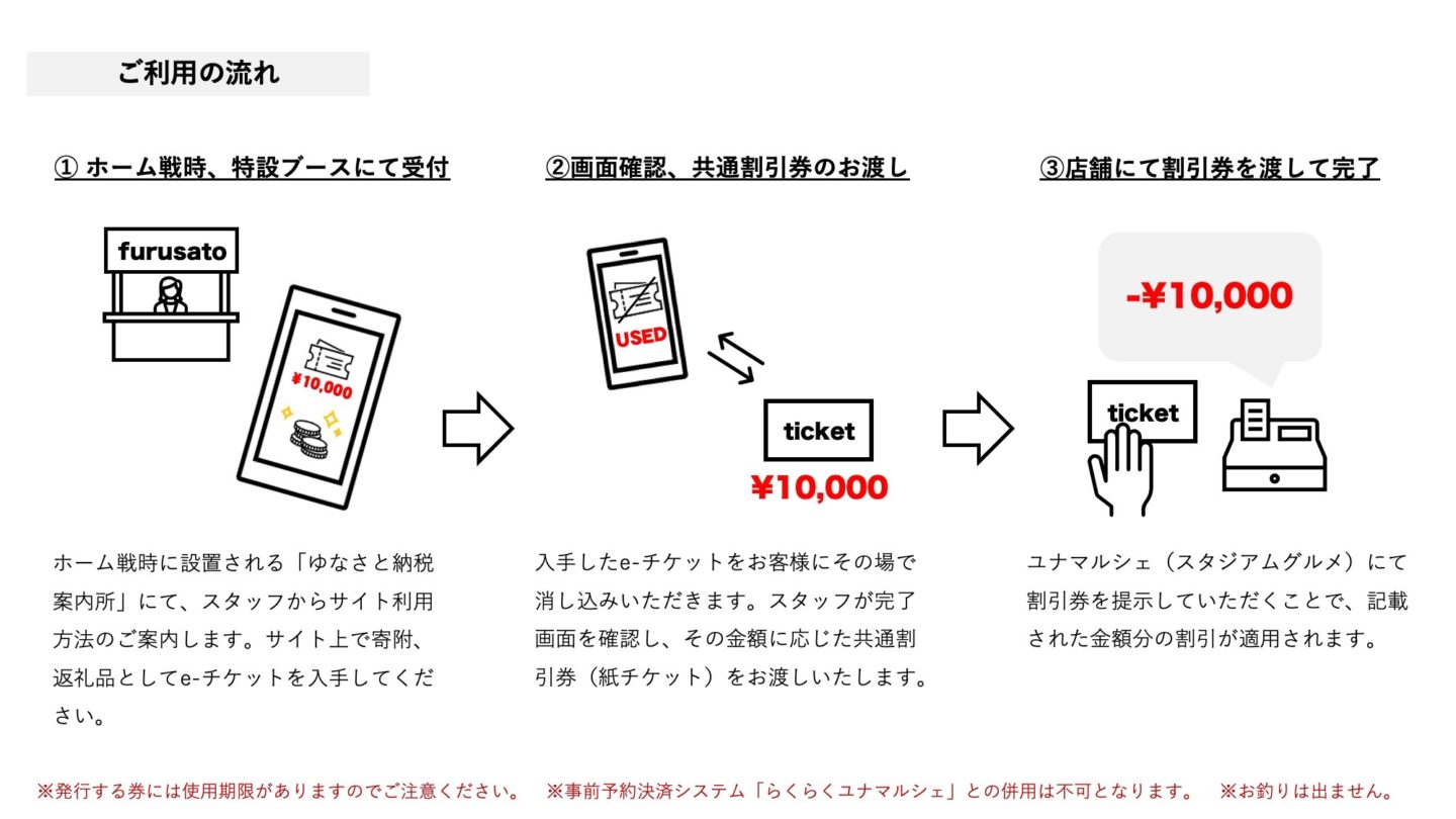 今シーズンから鹿児島市が導入している「ふるさとe-チケット」のシステムを利用して、ふるさと納税でスタジアムでのお買い物に使える割引券をゲットすることができます!