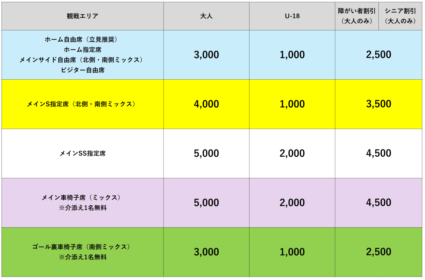 - ゴール裏車椅子席(南側ミックス)はメイン車椅子席(ミックス)が完売した場合のみの販売となります。
