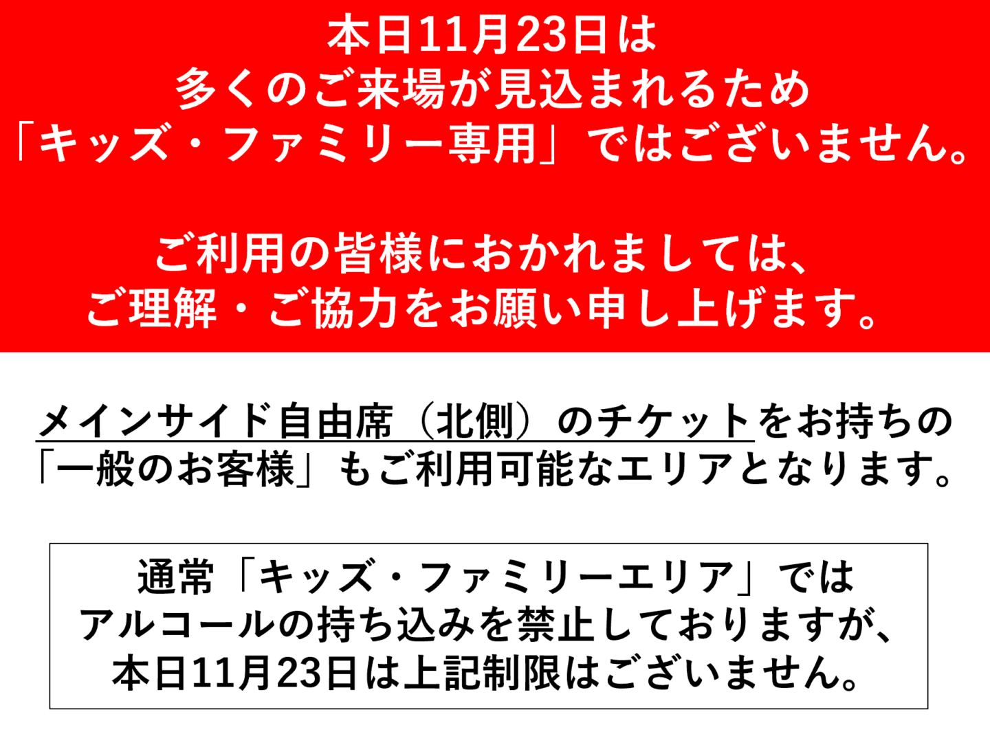 多くのご来場が見込まれるため、「キッズ・ファミリー専用」の運用ではございません。ご利用の皆様におかれましては、ご理解・ご協力をお願い申し上げます。メインサイド自由席(北側)のチケットをお持ちの「一般のお客様」もご利用可能なエリアとなります。通常「キッズ・ファミリーエリア」ではアルコールの持ち込みを禁止しておりますが、11月23日は制限はございません。