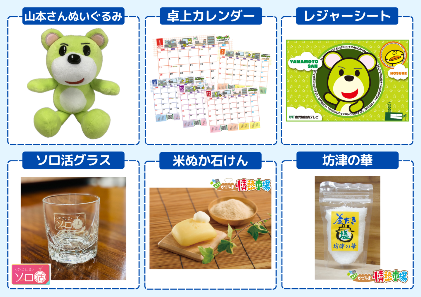 KYT鹿児島読売テレビのPRブースが登場!山本さんぬいぐるみや卓上カレンダーなどのNTV・KYTの番組グッズ販売や、情熱市場でご紹介した坊津の塩やみかんの試食販売を実施します。