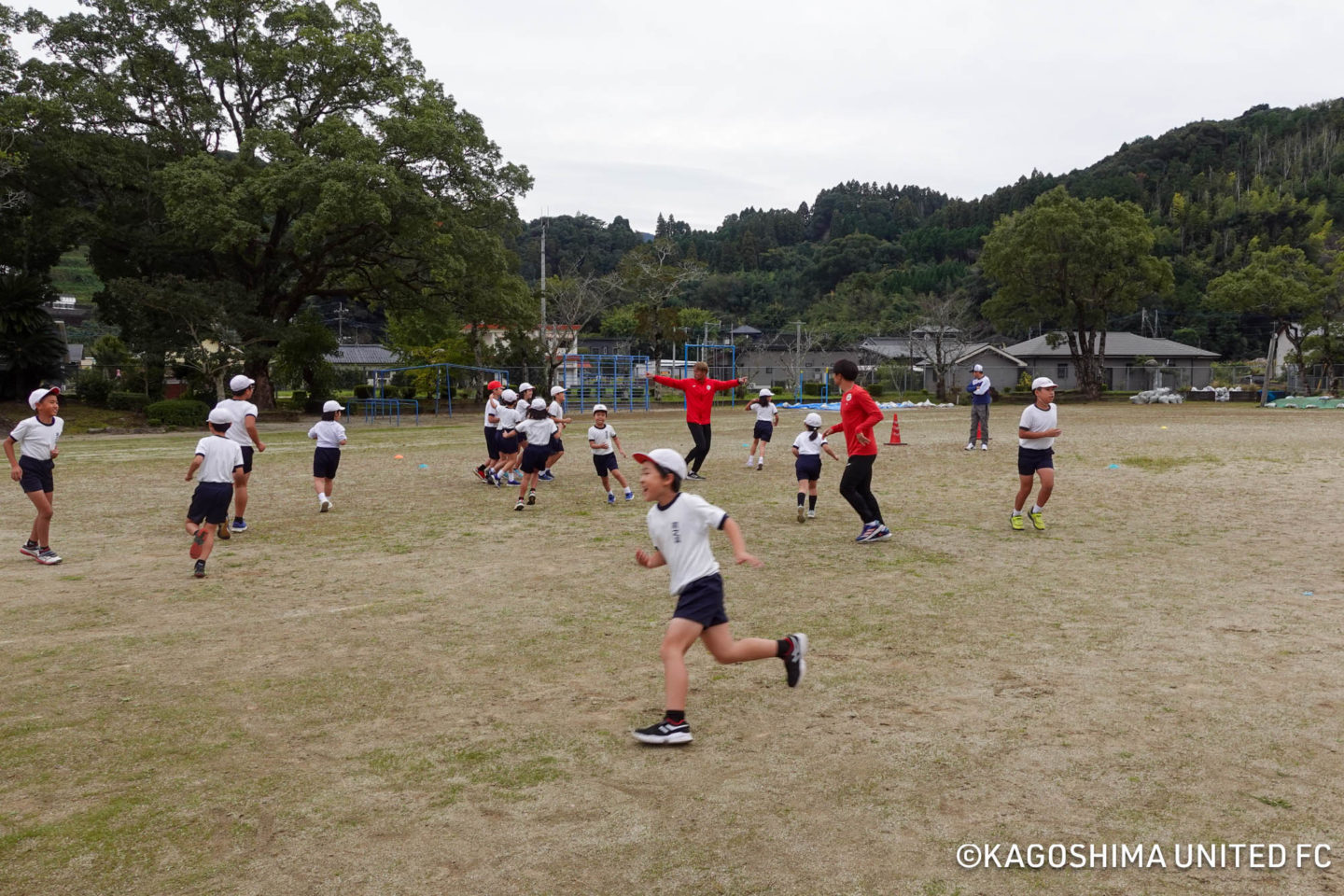 今回の訪問はJリーグ新人研修の一環としてのものであり、全校児童を対象にした運動教室を行いました。