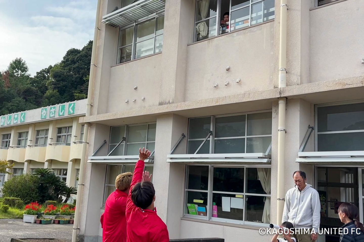 帰る時にも教室から呼びかける児童に応える川島選手と熊倉選手。