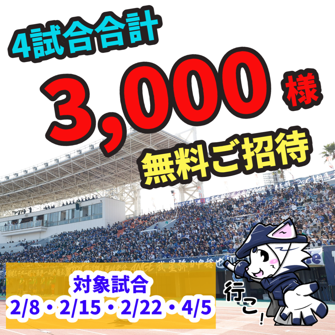 鹿児島ユナイテッドFCでは百年構想リーグ開幕キャンペーンとして、2/8(日)・2/15(日)・2/22(日)・4/5(日)の4試合を対象に合計3,000名様をご招待いたします。事前応募での抽選となります。詳細は以下をご覧ください。たくさんのご応募お待ちしております。
