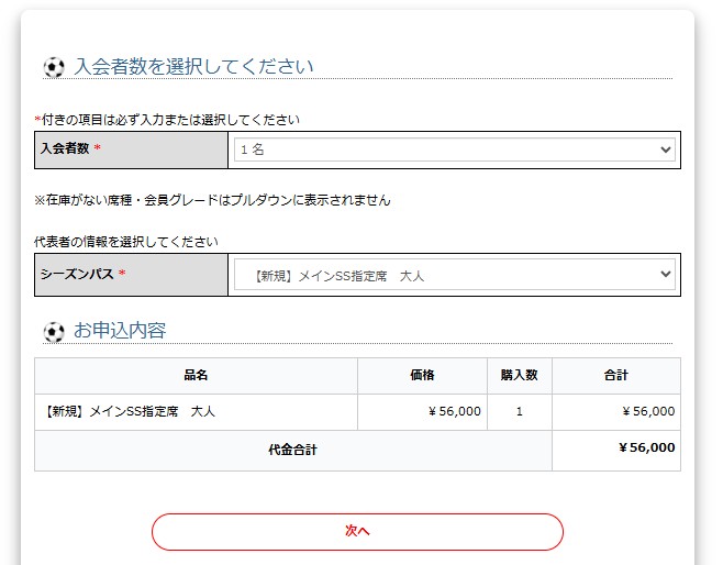 ご希望の観戦エリア・購入タイプを選択後に『次へ』を押してください。